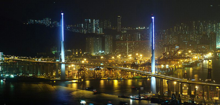 昂船洲大橋主跨1,018米,是全世界跨度最長的斜拉橋之一。大橋橫跨葵涌貨柜碼頭入口處的藍(lán)巴勒海峽,為香港這個(gè)全球最富活力的貿(mào)易中心之一提供地標(biāo)性通道。