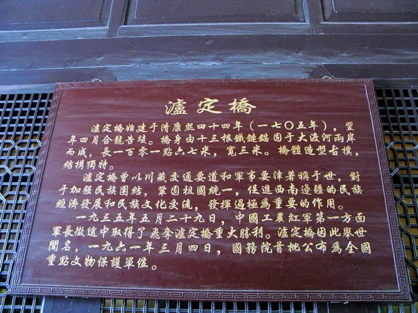 瀘定橋位于中國四川省瀘定縣,是一座橫跨大渡河的鐵索橋。它是中國紅軍長征途中的重要戰(zhàn)役地點,1935 年5 月29 日,中國工農(nóng)紅軍第一方面軍長征至此,成功飛奪瀘定橋,為紅軍北上打開了通道。
